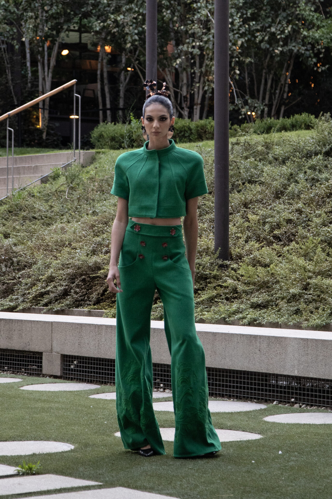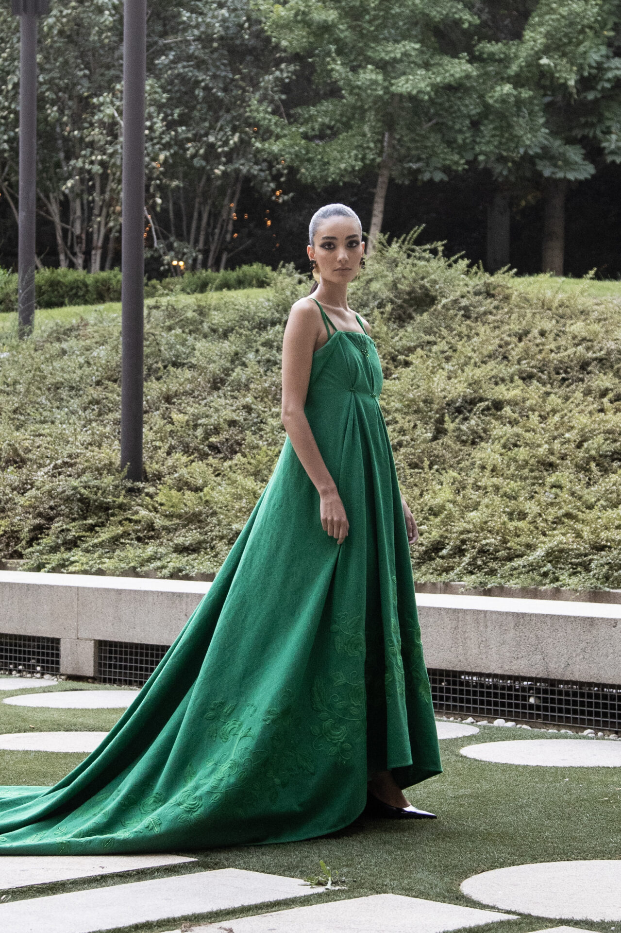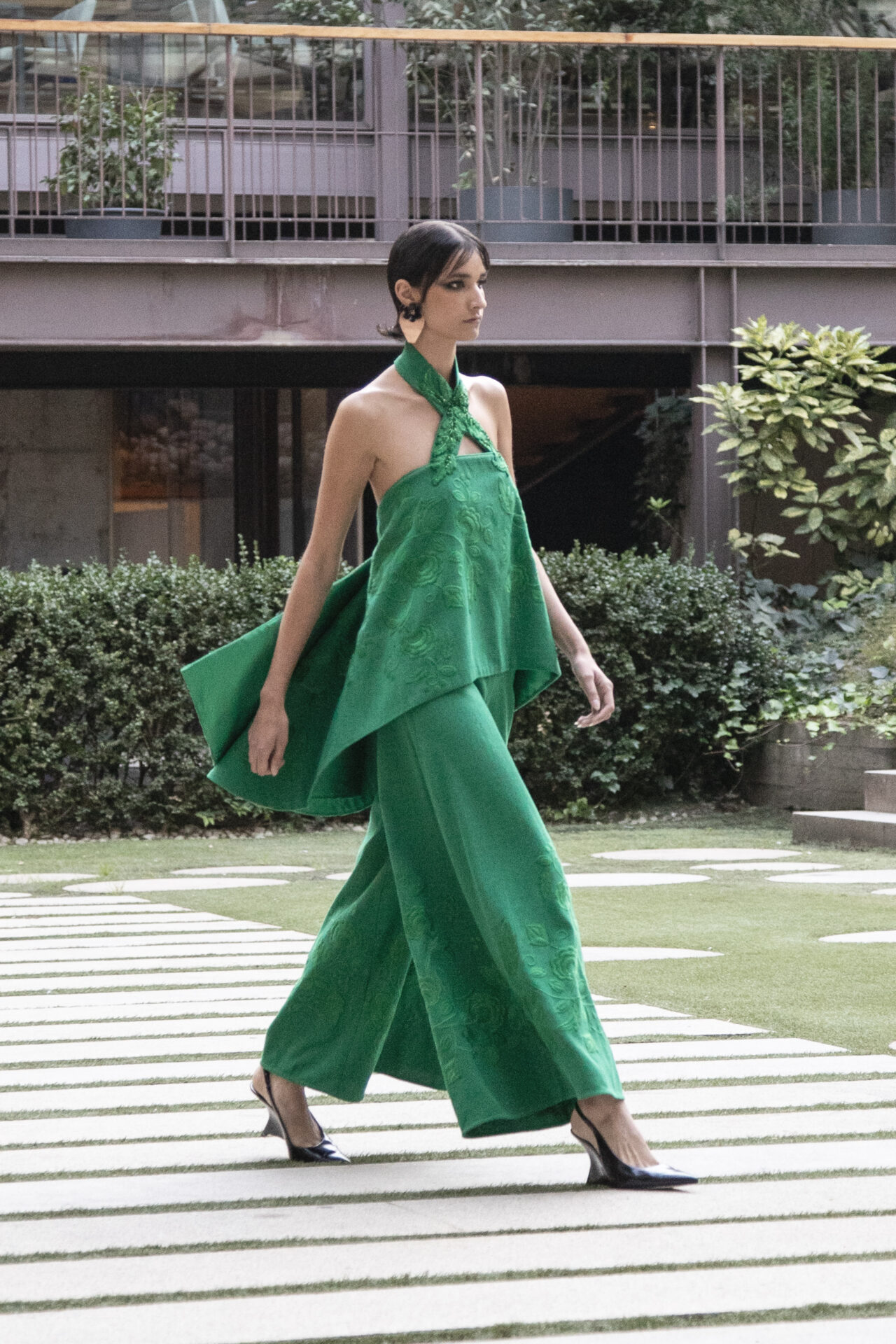 Los bloques de la colección secuencialmente ordenados, siguen una cadencia de looks monocolor. Blancos y crudos de cal en la cueva gitana, verde Andalucía de campo y chumbera, dorados de sol y cielo y negros zainos como la noche. El cobre, herencia y riqueza de la cultura local, salpica la colección.
