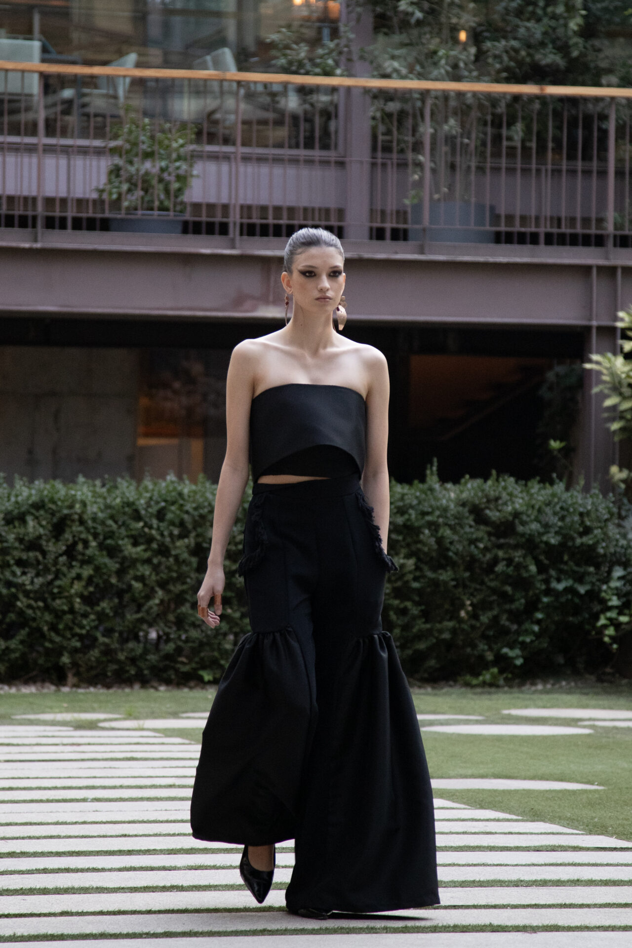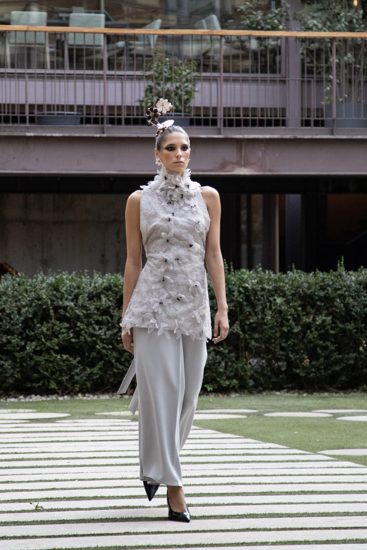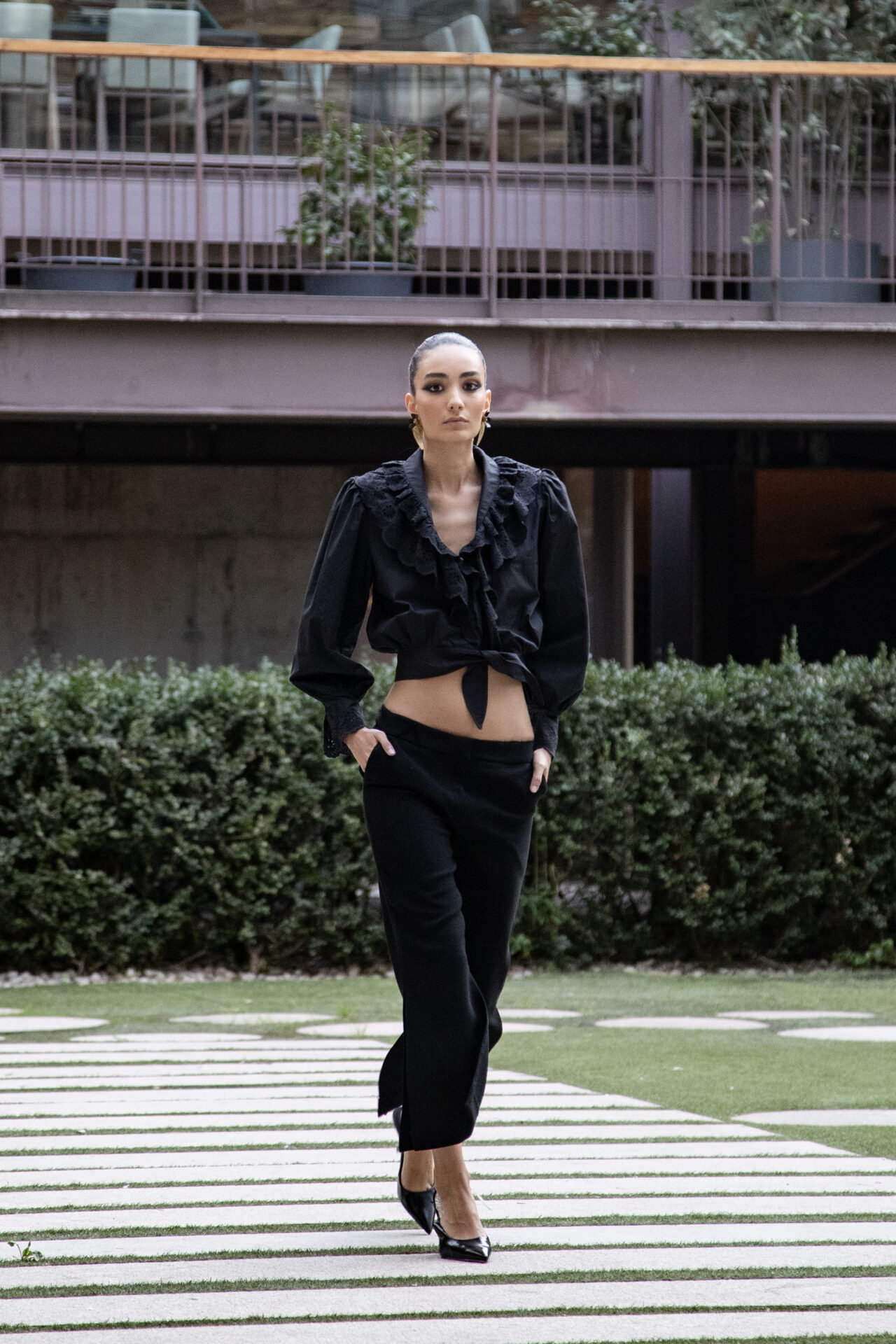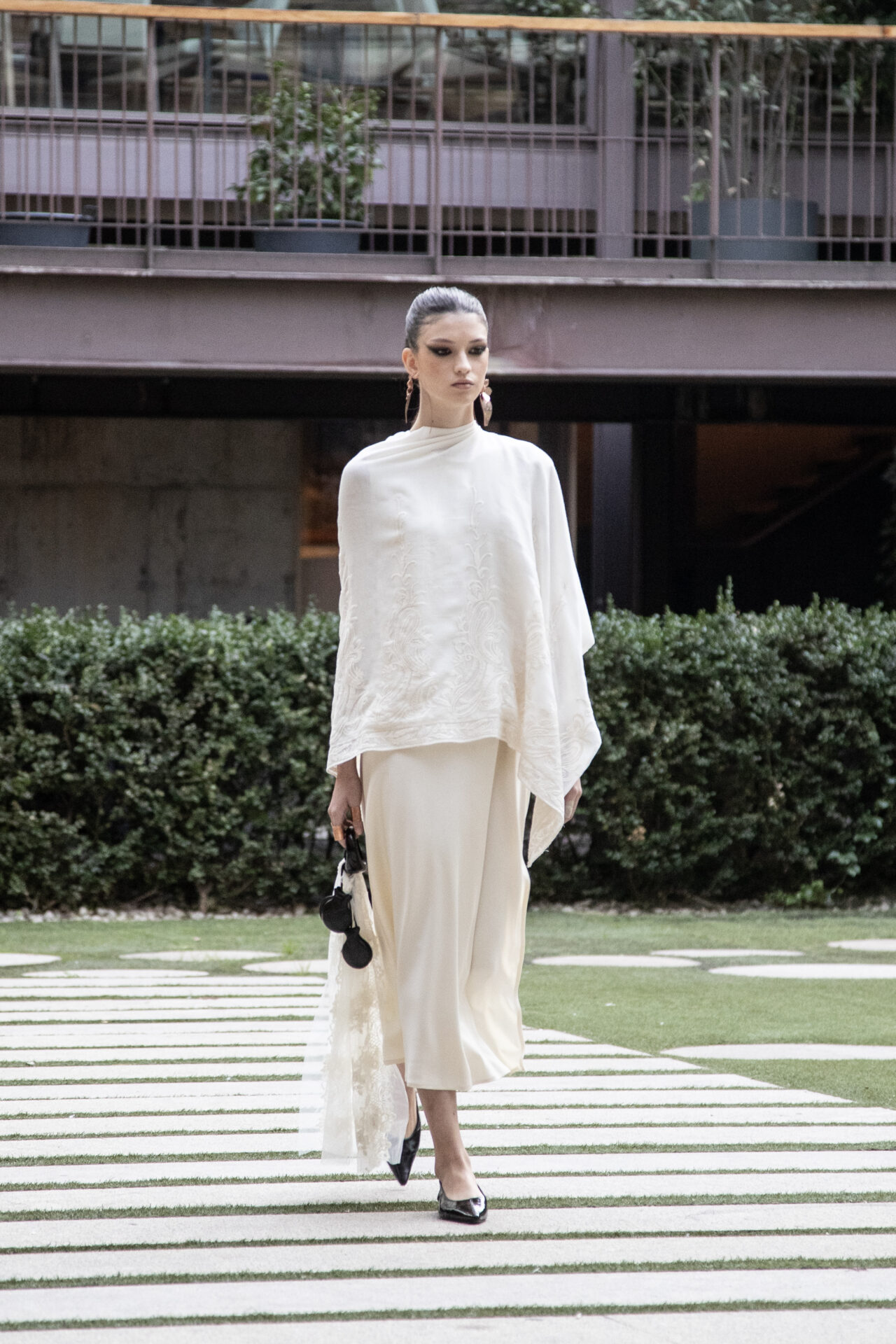 Zambra es además una apuesta por la reinterpretación de la silueta y el volumen del vestir flamenco: faldas con canesú y capas, volantes desestructurados, camisas de algodón a la cintura y mangas globo evocan el gesto de la danza. Vestidos fluidos y transparencias acompañan el movimiento del cuerpo. Las prendas se transforman, como la zambra, en un rito íntimo y poderoso interpretadas en clave moda. Los bordados artesanales, todos ellos elaborados en el taller de la marca, recuerdan los lunares, flores y filigranas de mantones antiguos, pero se presentan con una estética minimalista y abstracta. Aplicaciones metálicas y costuras a la vista sugieren el mestizaje entre lo urbano y lo ancestral.