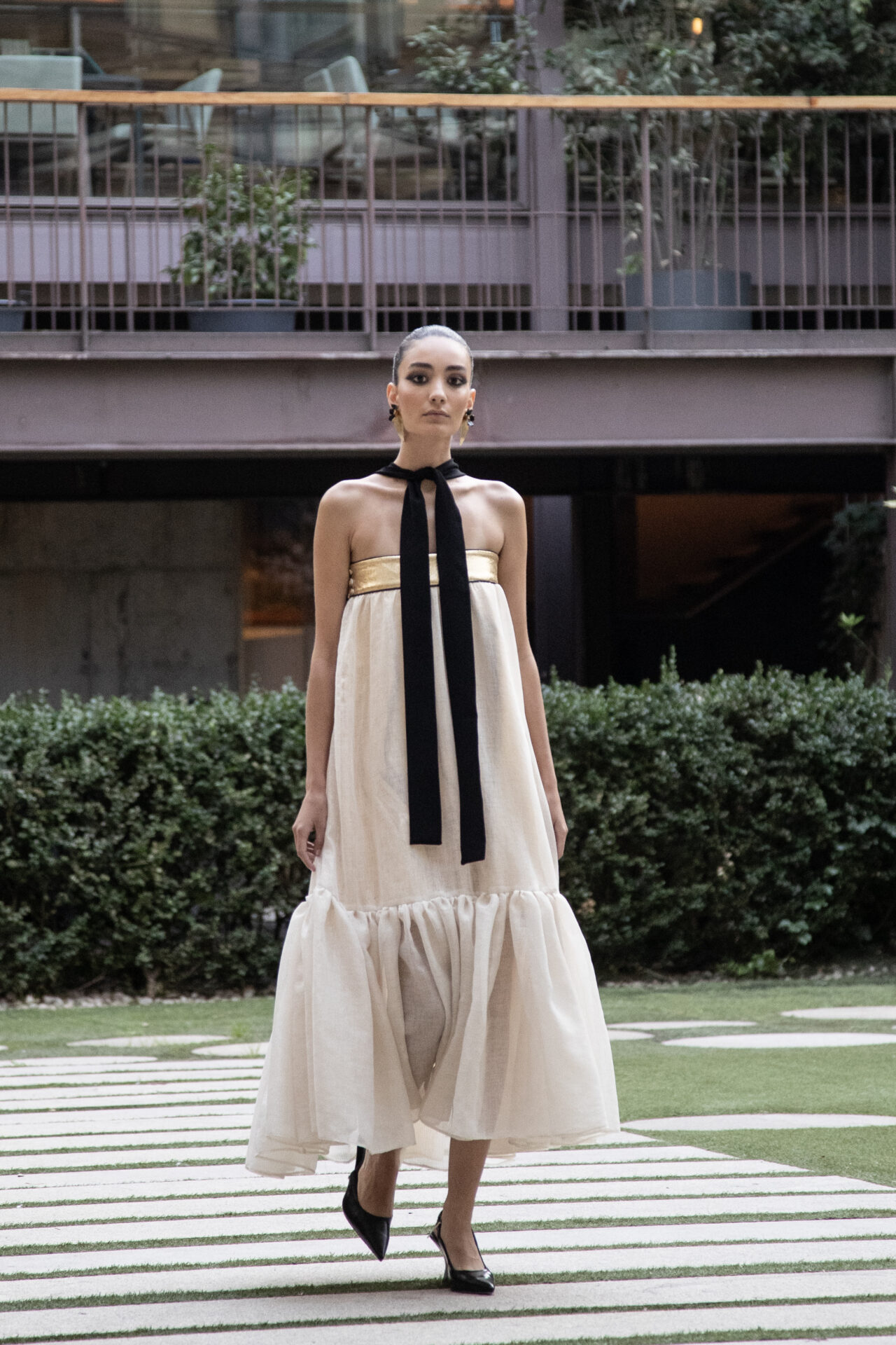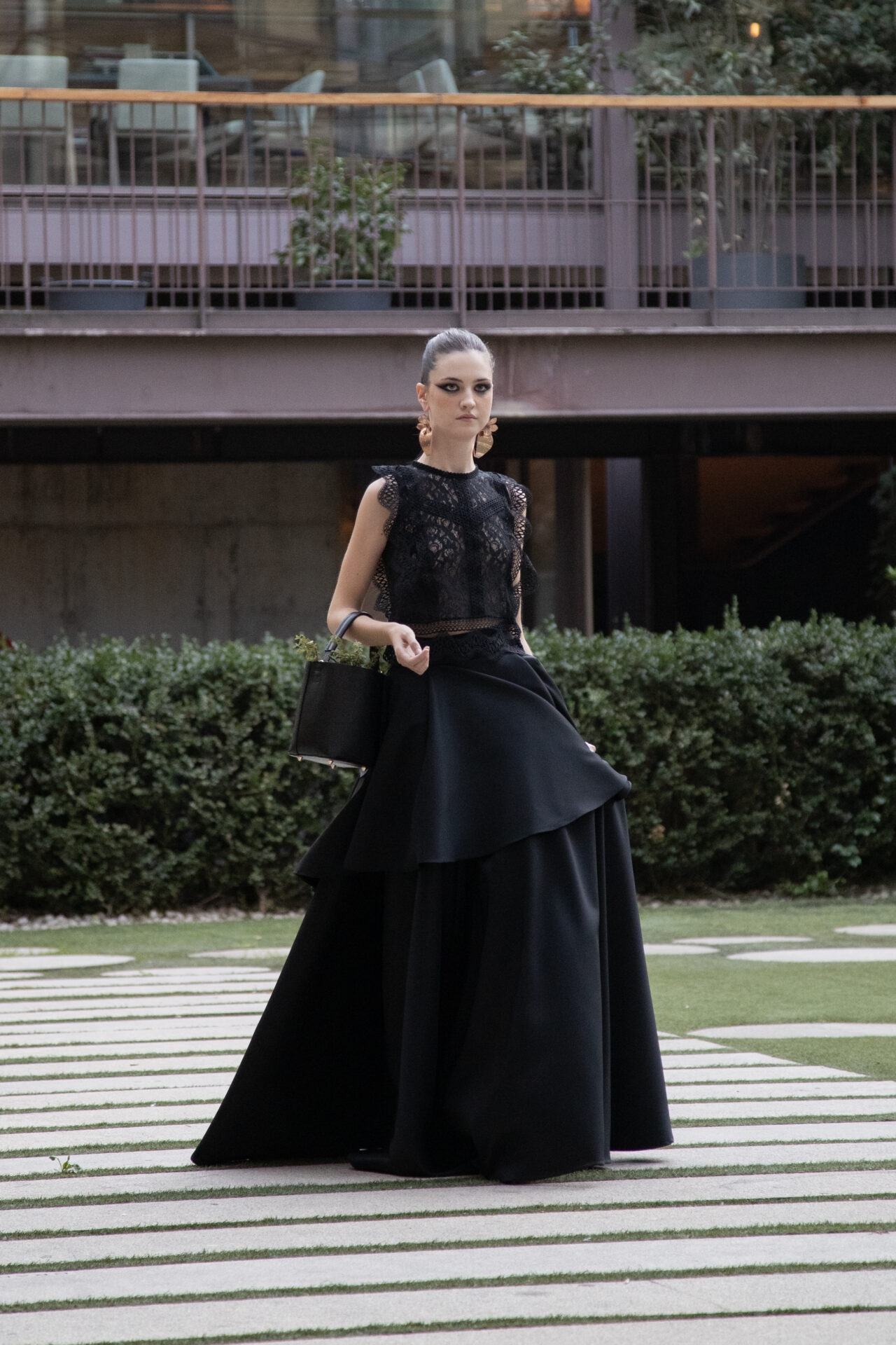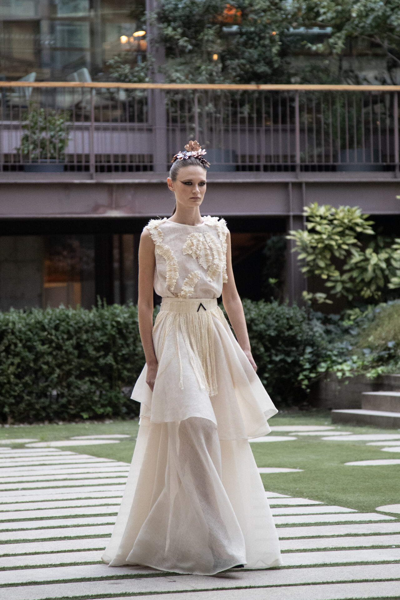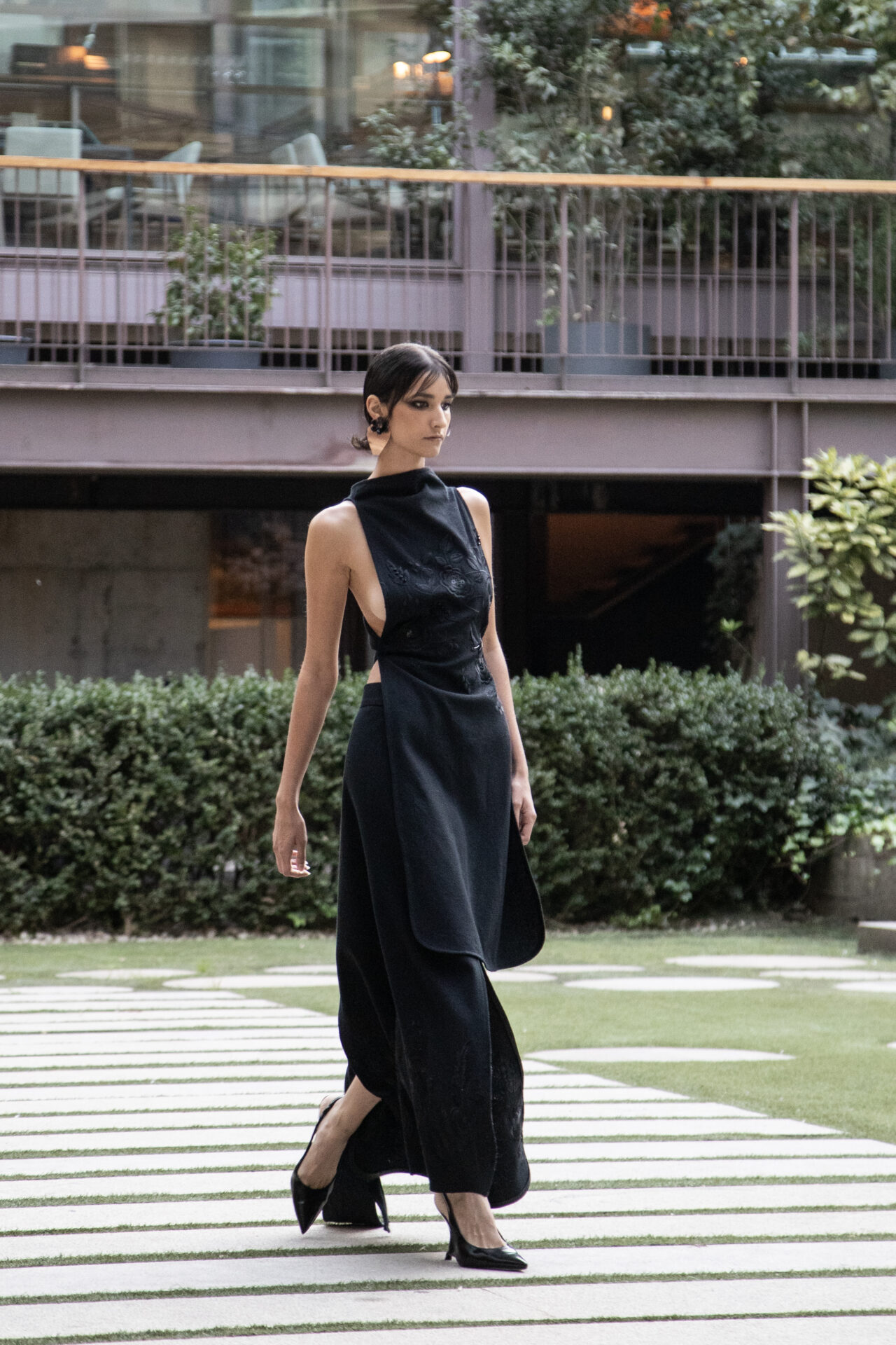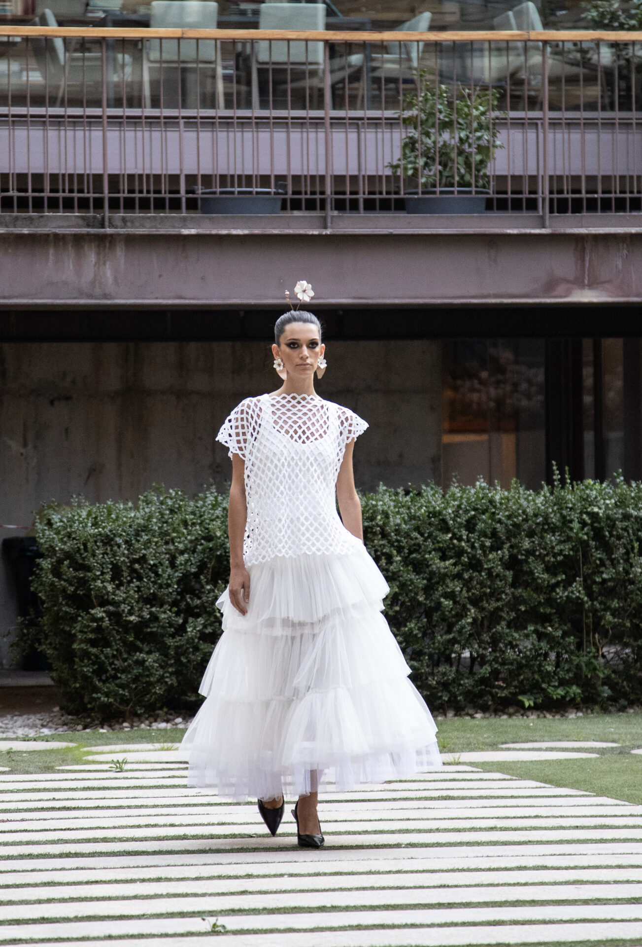 Zambra es además una apuesta por la reinterpretación de la silueta y el volumen del vestir flamenco: faldas con canesú y capas, volantes desestructurados, camisas de algodón a la cintura y mangas globo evocan el gesto de la danza. Vestidos fluidos y transparencias acompañan el movimiento del cuerpo. Las prendas se transforman, como la zambra, en un rito íntimo y poderoso interpretadas en clave moda. Los bordados artesanales, todos ellos elaborados en el taller de la marca, recuerdan los lunares, flores y filigranas de mantones antiguos, pero se presentan con una estética minimalista y abstracta. Aplicaciones metálicas y costuras a la vista sugieren el mestizaje entre lo urbano y lo ancestral.