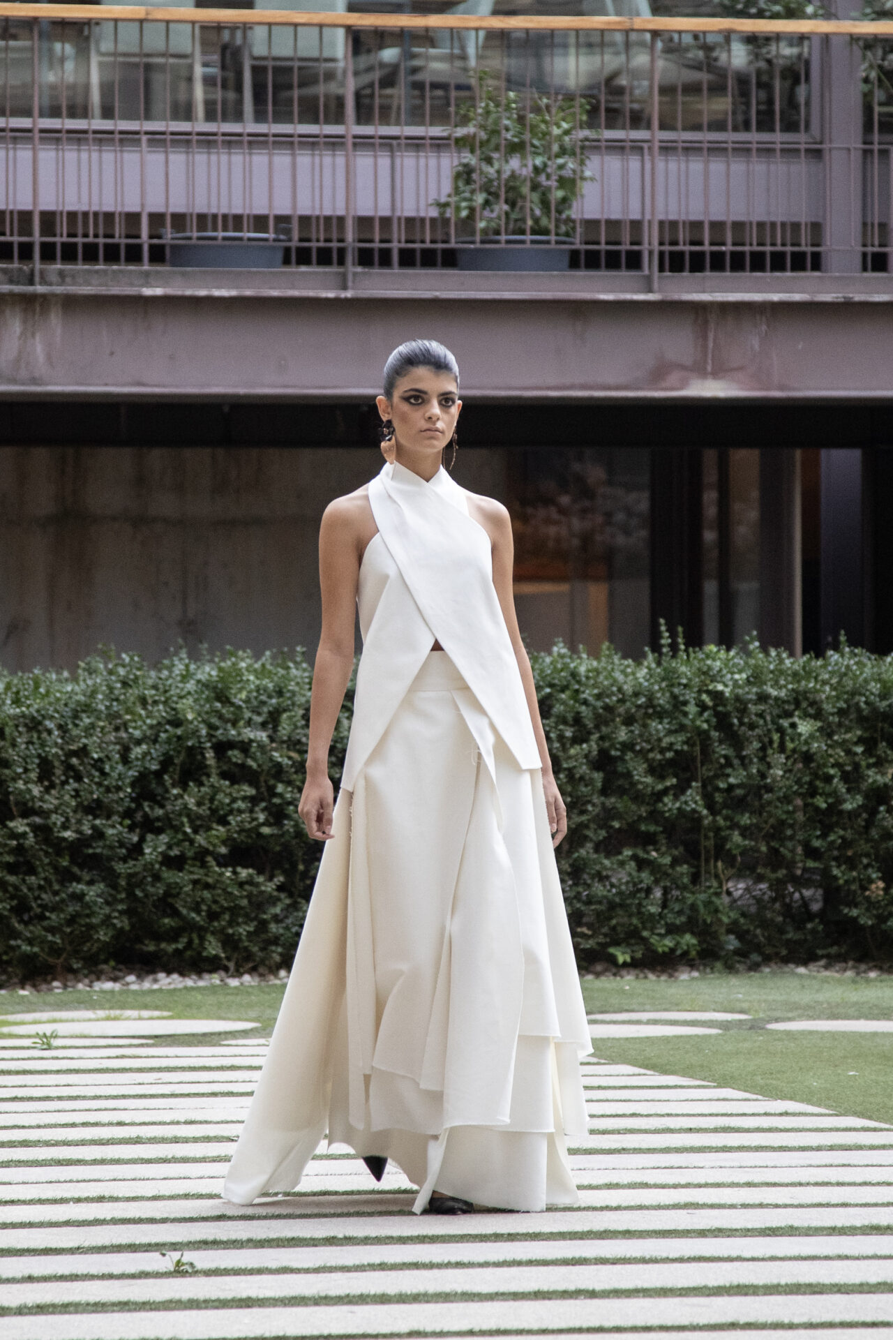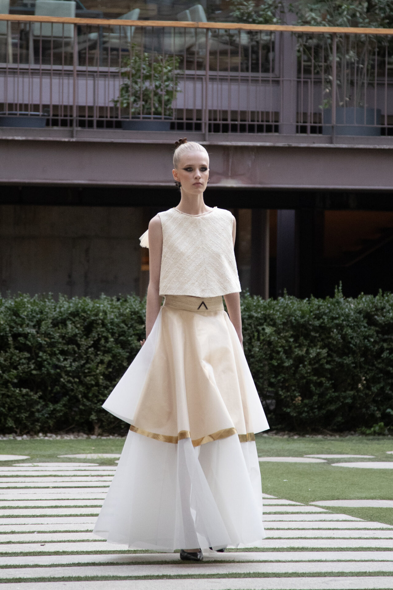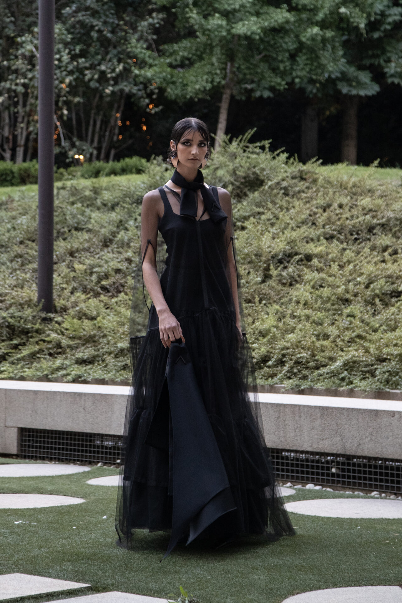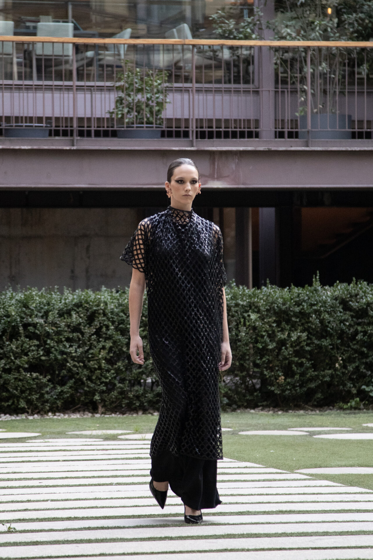 Zambra es además una apuesta por la reinterpretación de la silueta y el volumen del vestir flamenco: faldas con canesú y capas, volantes desestructurados, camisas de algodón a la cintura y mangas globo evocan el gesto de la danza. Vestidos fluidos y transparencias acompañan el movimiento del cuerpo. Las prendas se transforman, como la zambra, en un rito íntimo y poderoso interpretadas en clave moda. Los bordados artesanales, todos ellos elaborados en el taller de la marca, recuerdan los lunares, flores y filigranas de mantones antiguos, pero se presentan con una estética minimalista y abstracta. Aplicaciones metálicas y costuras a la vista sugieren el mestizaje entre lo urbano y lo ancestral.