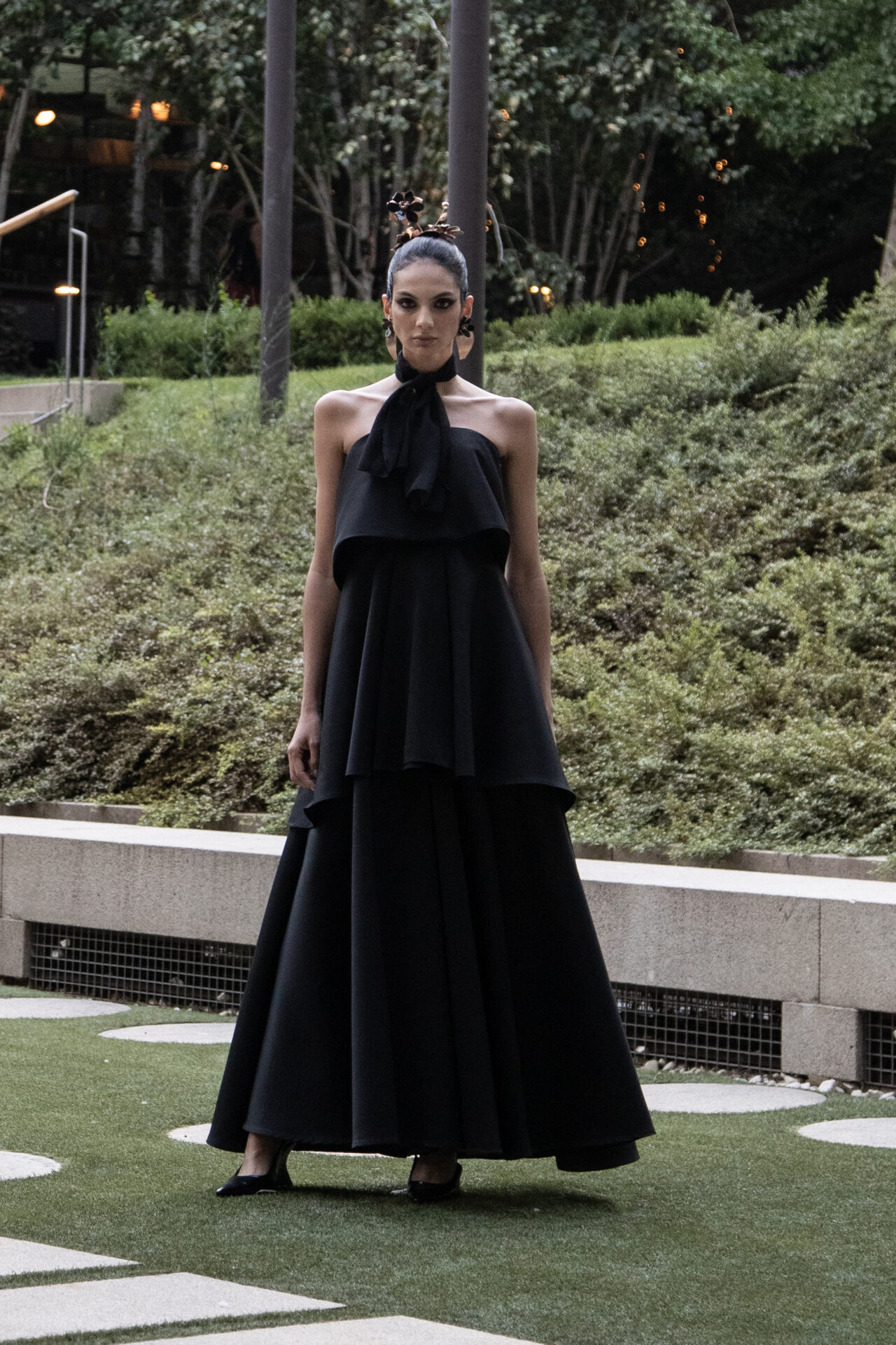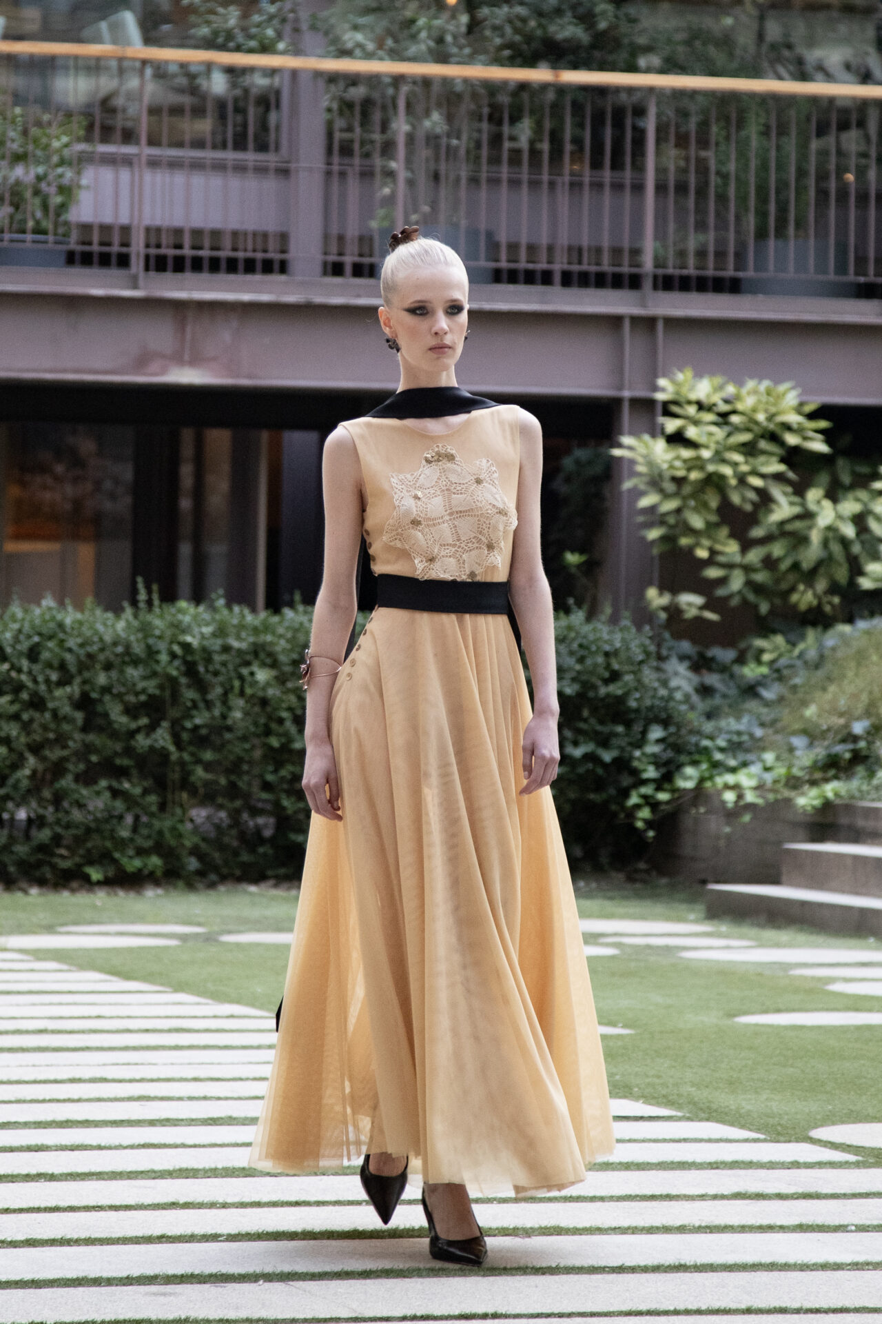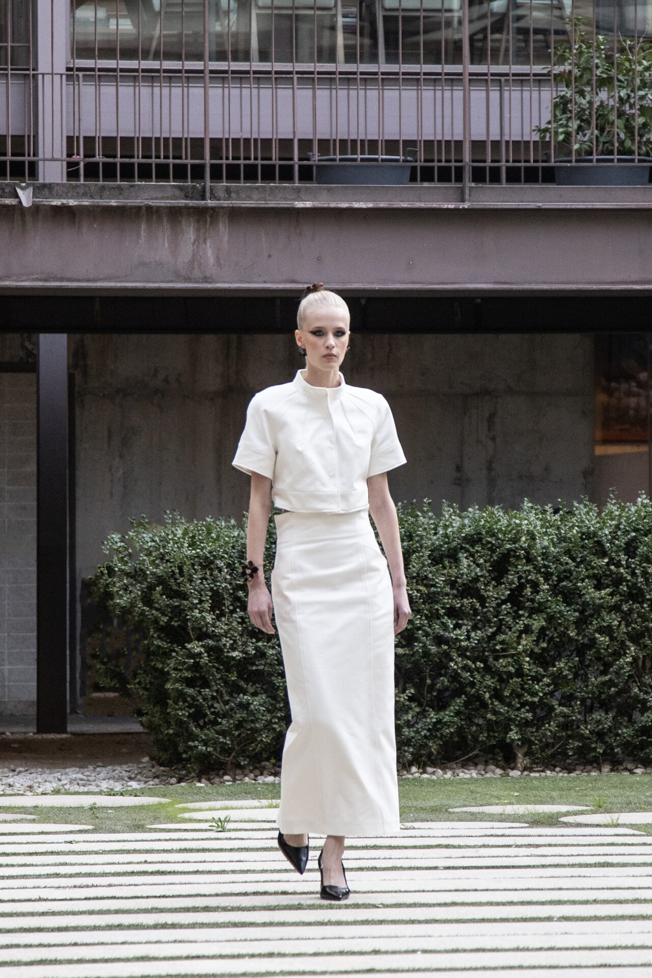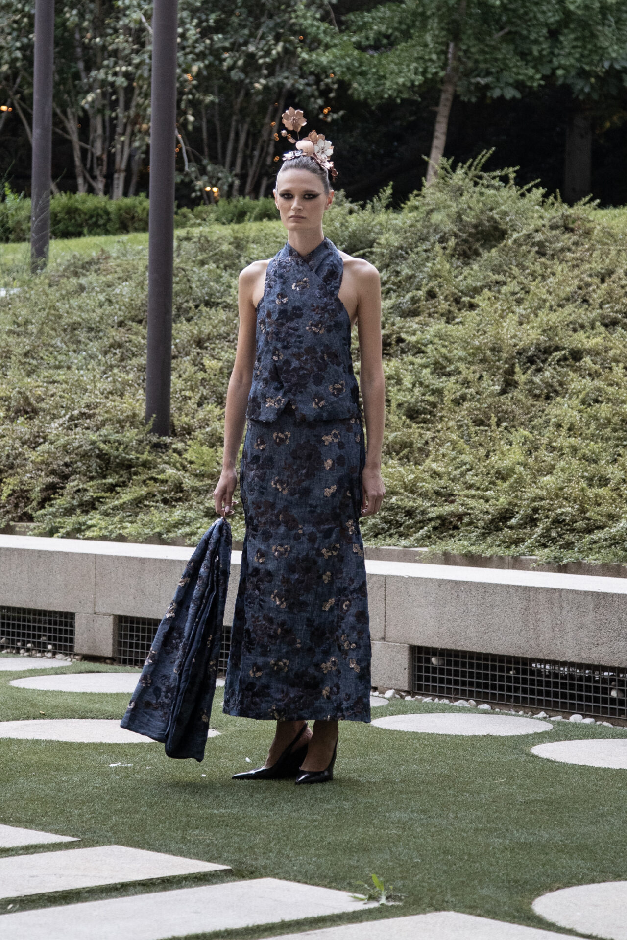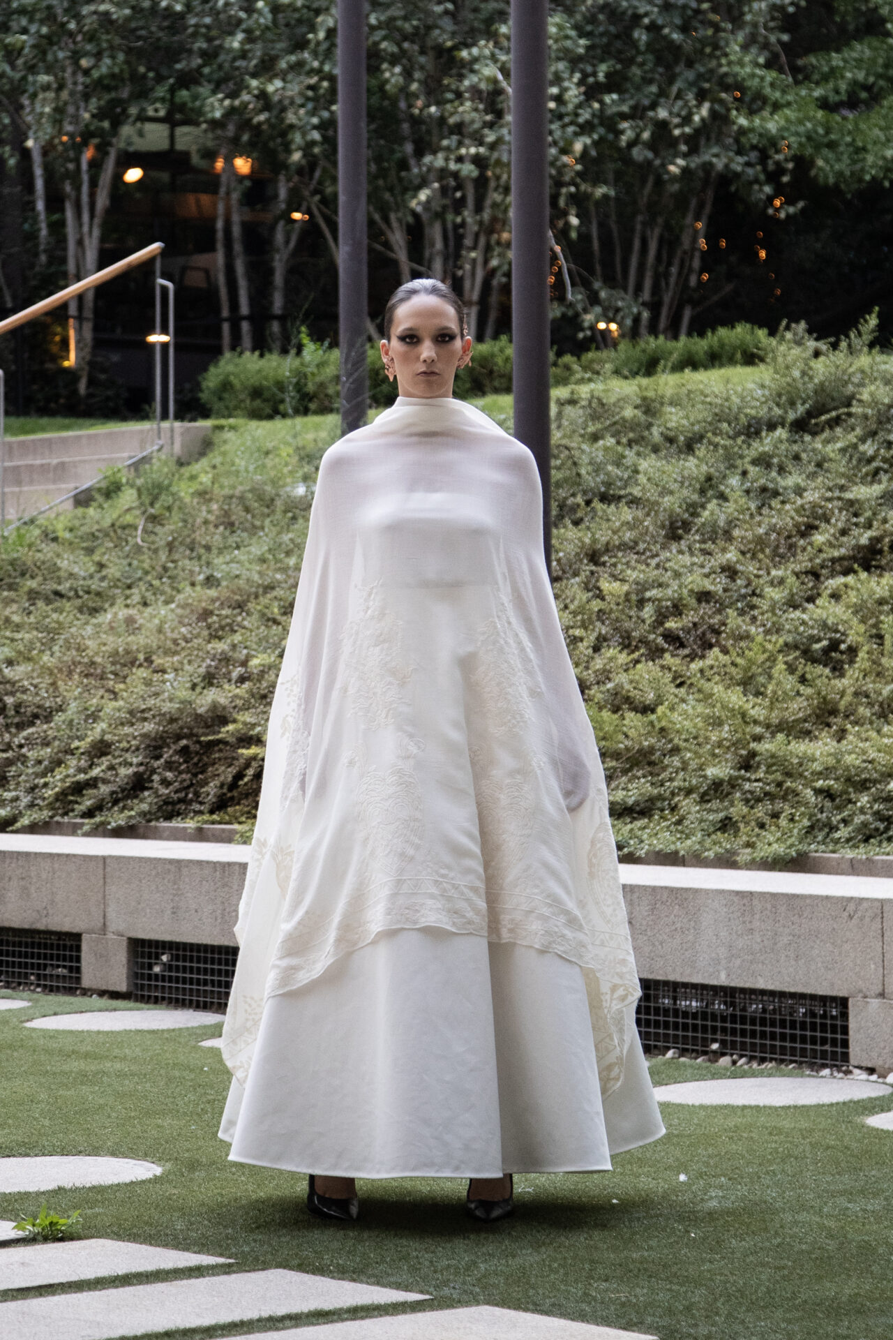 Zambra es además una apuesta por la reinterpretación de la silueta y el volumen del vestir flamenco: faldas con canesú y capas, volantes desestructurados, camisas de algodón a la cintura y mangas globo evocan el gesto de la danza. Vestidos fluidos y transparencias acompañan el movimiento del cuerpo. Las prendas se transforman, como la zambra, en un rito íntimo y poderoso interpretadas en clave moda. Los bordados artesanales, todos ellos elaborados en el taller de la marca, recuerdan los lunares, flores y filigranas de mantones antiguos, pero se presentan con una estética minimalista y abstracta. Aplicaciones metálicas y costuras a la vista sugieren el mestizaje entre lo urbano y lo ancestral.